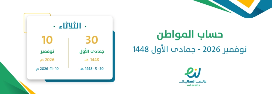 موعد صرف حساب المواطن نوفمبر 2026 – جمادى الأول 1448. في يوم الثلاثاء 30 جمادى الأول 1448 الموافق 10 نوفمبر 2026.