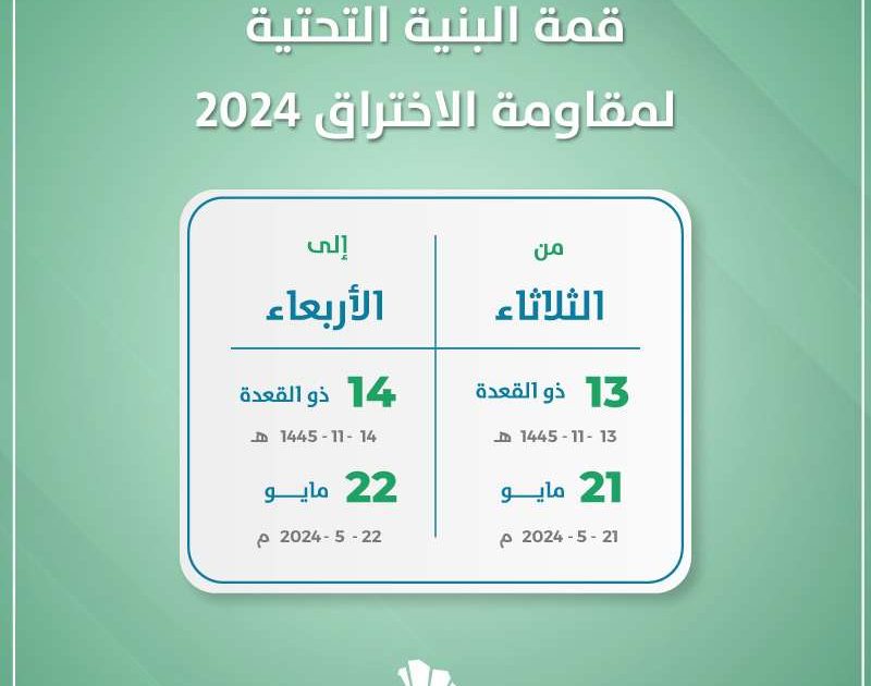ستقام بمدينة الدمام بالمملكة العربية السعودية قمة البنية التحتية لمقاومة الاختراق 2024. وذلك علي مدار يومي الثلاثاء والأربعاء الموافق الثالث عشر والرابع عشر من شهر ذو القعدة لعام 1445 هجريا. بينما يوافق هذا التاريخ الحادي والعشرين والثاني والعشرين من شهر مايو لعام 2024 ميلاديا.