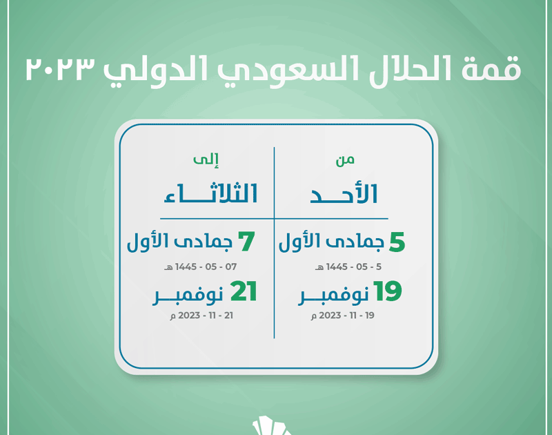 يشهد مركز الرياض الدولي للمؤتمرات فعاليات قمة الحلال السعودي الدولي 2023 خلال الفترة 19-21 نوفمبر. ويعد أكبر معرض حلال في منطقة الشرق الأوسط وشمال إفريقيا.