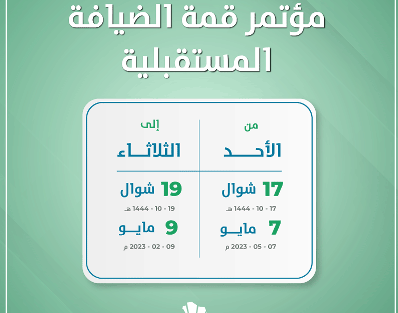 قمة الضيافة المستقبلية 2023 تنطلق في مدينة الرياض ليكون الحدث الأهم الذي يناقش آفاق نمو وتطور صناعة الضيافة في المملكة بمشاركة نخبة من الخبراء والمسؤولين والمطورين يومي 7- 9 مايو 2023 في الرياض.