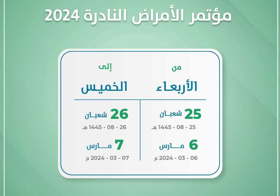سينعقد بالمدينة المنورة بالمملكة العربية السعودية مؤتمر الأمراض النادرة 2024. وذلك يومي الأربعاء والخميس السادس والسابع من شهر مارس لعام 2024 ميلاديا. بينما يوافق هذا التاريخ الخامس والعشرين والسادس والعشرين من شهر شعبان لعام 1445 هجريا.