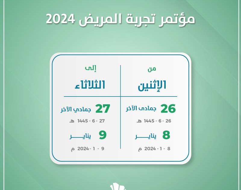 يقام بفندق كراون بلازا بمدينة الرياض بالمملكة العربية السعودية مؤتمر تجربة المريض 2024. وذلك علي مدار يومي الإثنين والثلاثاء الثامن والتاسع من شهر يناير لعام 2024 ميلاديا. بينما يوافق هذا التاريخ السادس والعشرين والسابع والعشرين من شهر جمادى الآخر لعام 1445 هجريا.