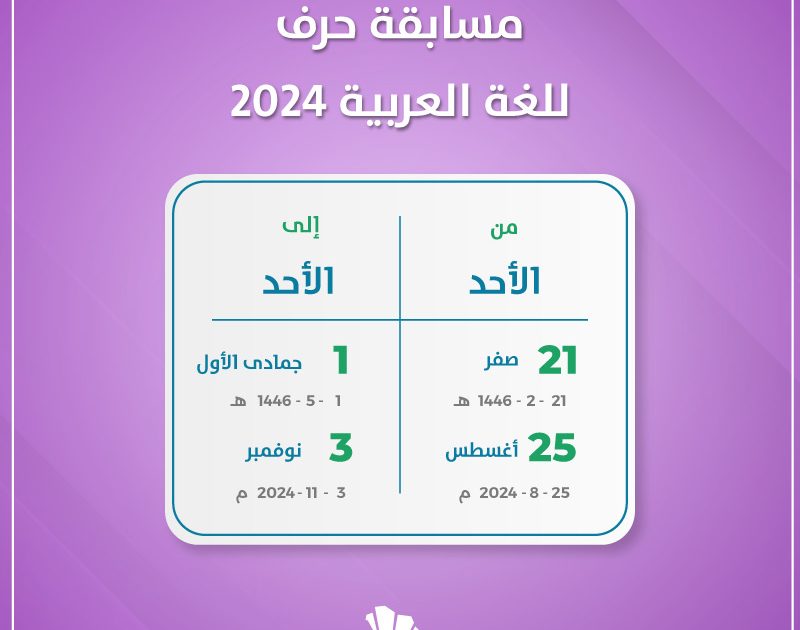 دعماً للقطاع الثقافي تنطلق النسخة الثانية من مسابقة حرف للغة العربية 2024. وذلك لتكون منصة لدعم اللغة بما يتماشى مع مستهدفات برنامج تنمية القدرات البشرية كأحد برامج تحقيق رؤية المملكة 2030.