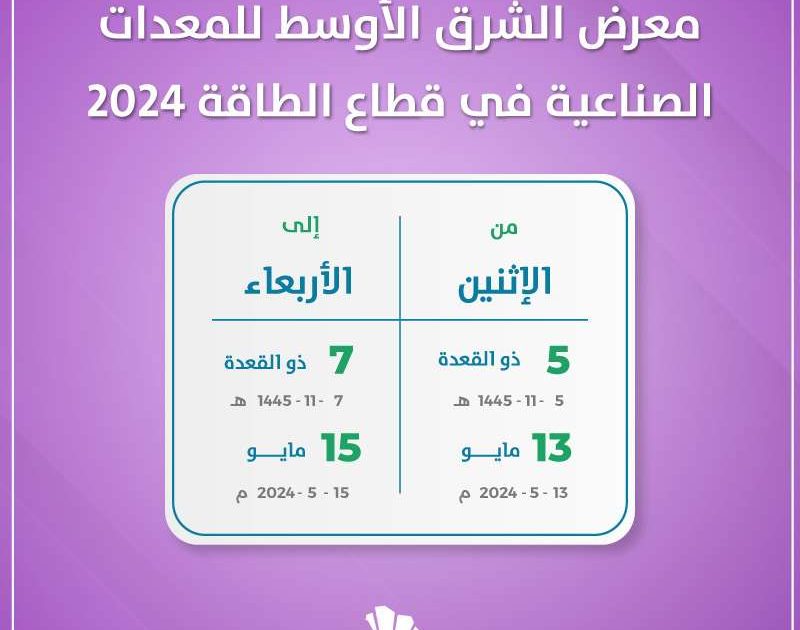 ينطلق بظهران أكسبو بالمملكة العربية السعودية معرض الشرق الأوسط للمعدات الصناعية في قطاع الطاقة 2024. وذلك من الإثنين الموافق الثالث عشر من شهر مايو وحتى الخامس عشر من الشهر نفسه لعام 2024 ميلاديا. بينما يوافق هذا التاريخ الخامس وحتى السابع من شهر ذو القعدة لعام 1445 هجريا.