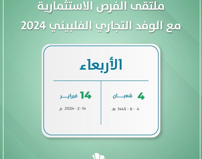 ويستقبل ملتقى الفرص الاستثمارية مع الوفد التجاري الفلبيني 2024 المشاركين فيه يوم 14 فبراير. ويتخصص الحدث في بحث الفرص الاستثمارية خاصة لاستيراد مواد الأغذية وأدوات العناية الشخصية.