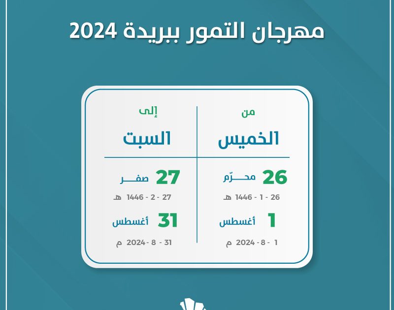 يشهد شهر أغسطس انطلاق مهرجان التمور ببريدة 2024 وحتى نهاية شهر أغسطس في مدينة بريدة ليكون أكبر المهرجانات في العالم.