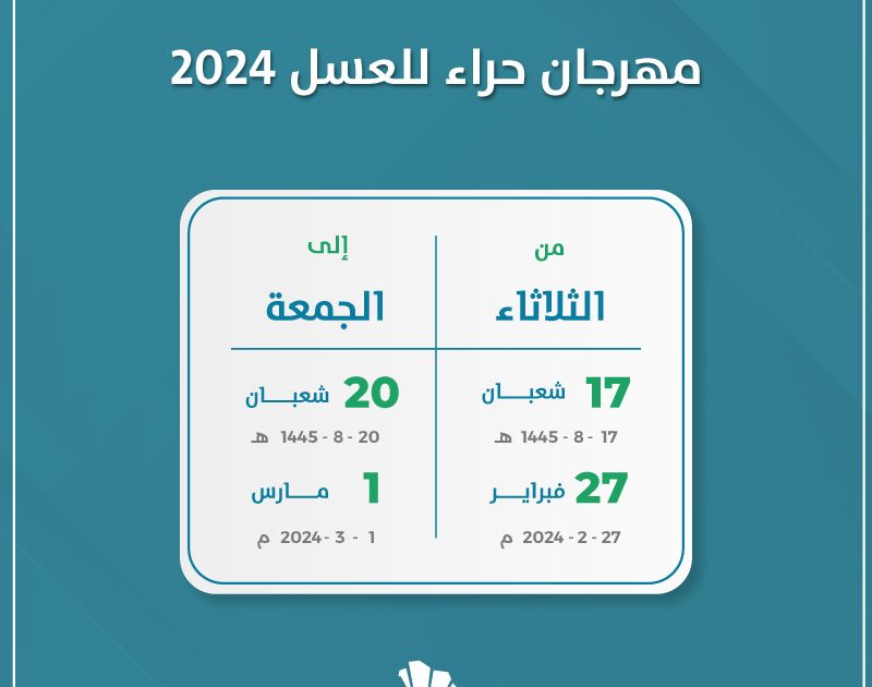 مهرجان حراء للعسل، يستمر حتى يوم الجمعة الموافق 1 مارس، وذلك من الساعة 4 مساءً حتى الساعة العاشرة ليلاً.