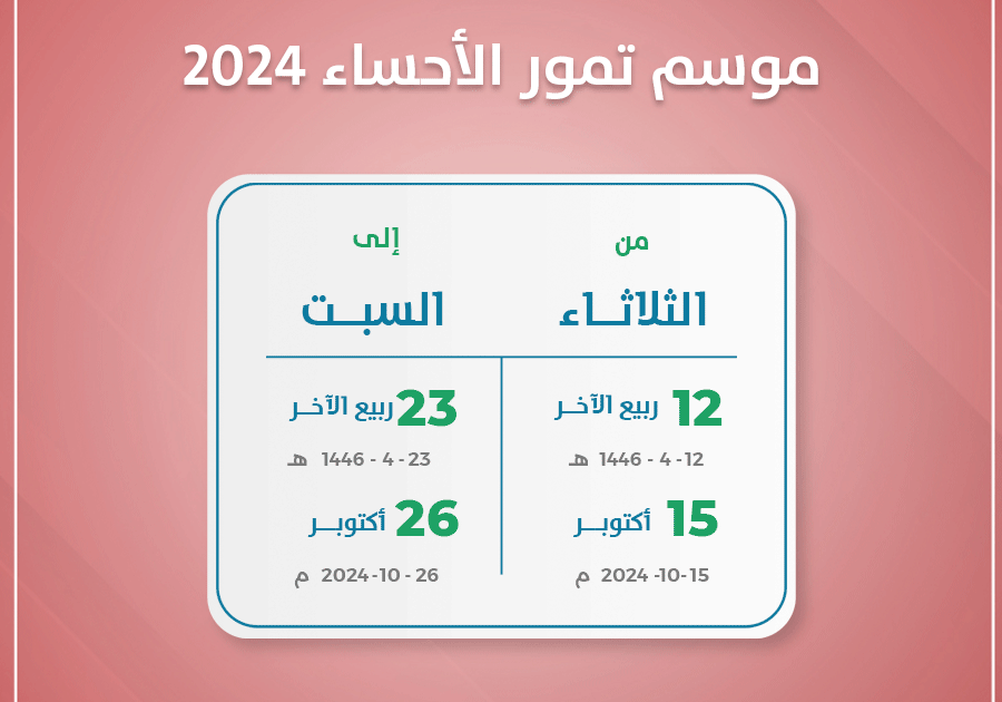 في أجواء زراعية ينطلق موسم تمور الأحساء 2024 خلال الفترة 15 – 26 أكتوبر. حيث يعقد فعاليات وأنشطة تجارية متنوعة تناسب جميع فئات الجمهور.