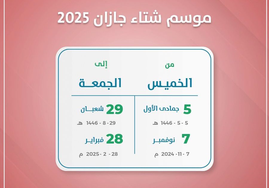 تستعد أمانة منطقة جازان لإستقبال موسم شتاء جازان 2024 والمقرر في الفترة من السابع من نوفمبر 2024 وحتي الرابع والعشرون من فبراير 2025 الموافق الخامس من جمادى الأول وحتي التاسع والعشرون من شعبان 1446 هجري .