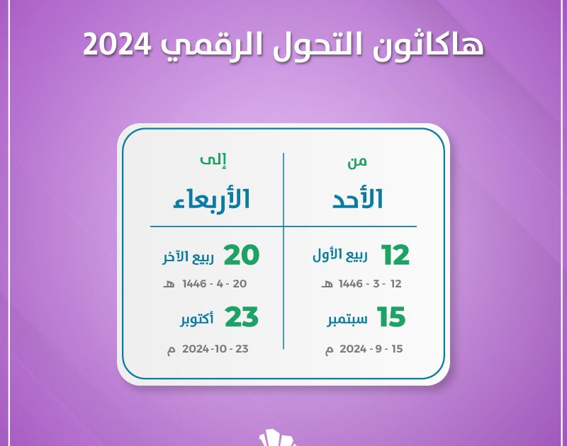 أنطلق هاكاثون التحول الرقمي 2024 ذلك يوم الأحد الخامس عشر من سبتمبر 2024 الموافق الثاني عشر من ربيع الأول 1446 هجري. حتي الأربعاء الثالث والعشرون من أكتوبر 2024 الموافق العشرون من ربيع الآخر 1446 هجري.