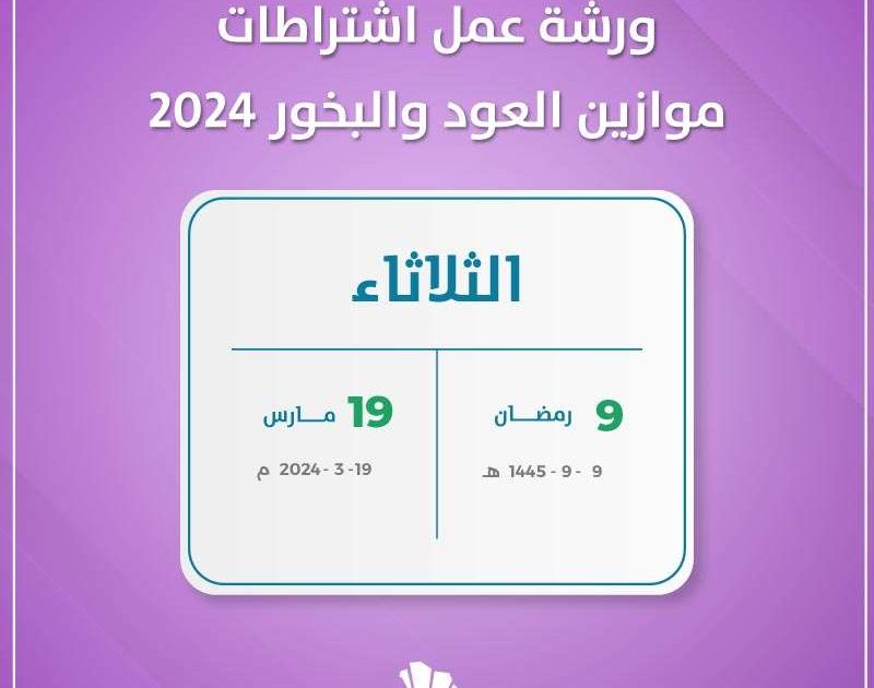 ستقام عبر التصوير المرئي (أونلاين) ورشة عمل اشتراطات موازين العود والبخور 2024. وذلك يوم الثلاثاء التاسع من شهر رمضان لعام 1445 هجريا. بينما يوافق هذا التاريخ التاسع عشر من شهر مارس لعام 2024 ميلاديا.