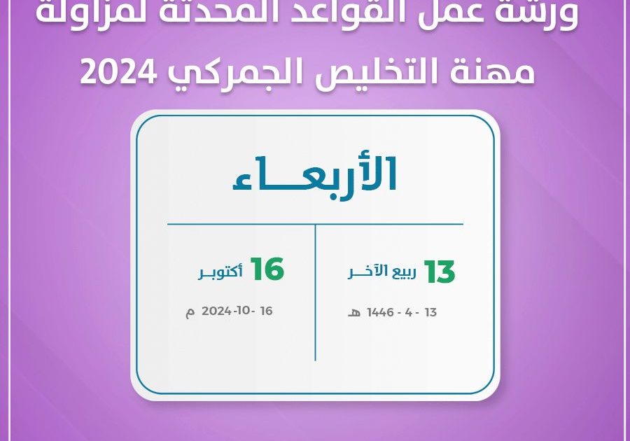 تستعد هيئة الزكاة والضريبة والجمارك لإستقبال ورشة عمل القواعد المحدثة لمزاولة مهنة التخليص الجمركي 2024 والمقرر إقامتها يوم السادس عشر من أكتوبر 2024 الموافق الثالث من ربيع الآخر 1446 هجري.